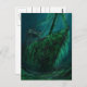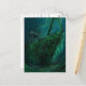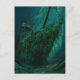 A shipwreck covered in seaweed lies on the ocean floor, bathed in an eerie glow.