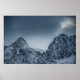 Cold and cloudy day at the snowy mountains with just a hint of sunlight through the clouds.
