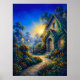 Golden morning light spills across a charming cottage garden, illuminating winding stone paths and vibrant blooms in soft, radiant color. Ivy climbs along the cottage walls as distant homes rest quietly beneath a glowing sky. The scene captures the peaceful stillness of early morning, where warmth, beauty, and a sense of home come together in a gentle, dreamlike landscape.