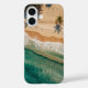 A sunlit aerial view of turquoise waves and golden beaches with palm trees. A perfect summer design for phone cases.