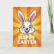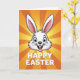 Designed with a cheerful digital illustration style, this Easter card features the close-up head of a cartoon rabbit with snowy white fur and bright blue eyes 🐰. The rabbit’s open smile shows two prominent front teeth, and its long upright ears have soft pink inner shading that frames the face in a friendly, affectionate way, like it’s leaning in for a warm hello. Behind the rabbit, a golden-yellow burst radiates outward into a deep sunny orange, creating a spotlight effect that feels like spring sunshine. The fur around the cheeks is lightly textured, adding a cuddly look against the smoother shapes of the face. Centered beneath the rabbit, a festive message appears in bright white letters with a faint shadow for depth, standing out clearly against the warm background 🌷. The overall layout keeps the character large and front-facing, with the text anchored below so your eyes move naturally from the smile to the greeting. The background shows a yellow-to-orange sunburst with rays spreading evenly from behind the rabbit’s head.