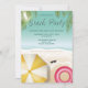 Set the tone for a sunny celebration with this beach-themed birthday invitation card designed by Destei. Light teal ocean meets the sandy shore while tropical palm leaves and a peek of sun brighten the scene on the top. On the sand, a yellow striped beach umbrella, pink swim ring and black sunglasses add playful summer vibes. The center has space to write the party details.
