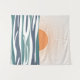 Abstract illustration of sunrise with orange sun and blue, white and turquoise sea waves decoration