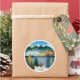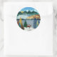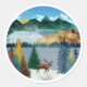 A beautiful landscape with unique colours and textures showing a mountain and lake landscape and multi-coloured forest with a rising sun and a moose in shades of blue, green, gold, and magenta.