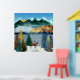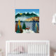 A beautiful landscape with unique colours and textures showing a mountain and lake landscape and multi-coloured forest with a rising sun and a moose in shades of blue, green, gold, and magenta.