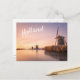 Photo postcard of a landscape with a row of three traditional windmills and reeds along a frozen river during a colourful sunrise in winter in Leidschendam in the Netherlands with in white the text 'Holland'.
