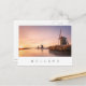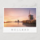 Magnet photo card of a landscape with a row of three traditional windmills and reeds along a frozen river during a colourful sunrise in winter in Leidschendam in the Netherlands with a white edge and the text 'Holland'.