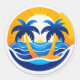 Bright, stylized sun rises over blue waves in a circular emblem. Ideal for beach, travel, summer, or inspirational themes. Bold colors and clean lines suit logos, stickers, and branding.