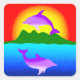 A beautiful rainbow coloured image of two purple dolphins and green hills. One is jumping into the sunset and the other is swimming through the ocean.