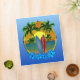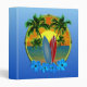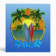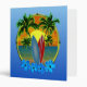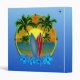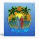 Beautiful beach sunset behind surfboards and palm trees, framed with bamboo and hibiscus flowers.