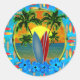 Beautiful beach sunset behind surfboards and palm trees, framed with bamboo and hibiscus flowers. With a pattern of retro surfboards background.