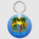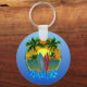 Beautiful beach sunset behind surfboards and palm trees, framed with bamboo and hibiscus flowers.