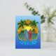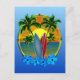 Beautiful beach sunset behind surfboards and palm trees, framed with bamboo and hibiscus flowers.