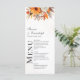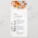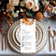 Beautiful, vibrant orange and white florals accentuate this wedding "Sunset Autumn Floral Watercolor Wedding Menu". Featuring soft coral, and touches of sage green, brown and burgundy, this design has an essence of timeless elegance to your big day.