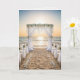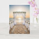 A beautifully decorated wedding arch stands on a sandy beach, framed by rows of chairs adorned with white tulle fabric and flowers.