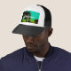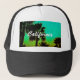 Trucker hat with the image of some palm trees in the blue and orange sunset with "California" written in the dead centre with white cursive. I love going on trips to California, and this hat is a reminder of all my vacations there.