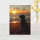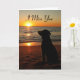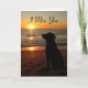 A silhouette of a dog sits on a beach at sunset. The words I Miss You above her.