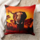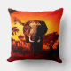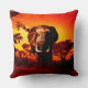 A bull elephant appears from the brush, bathed in the scarlet sunset.