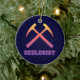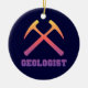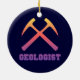 Geologist - dark blue ornament with collegiate style lettering and crossed rock hammers graphic in orange, red and purple sunset colours.