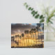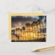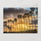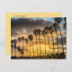 Postcard featuring a row of palm trees with a golden sunset behind them along the California coastline. Photo taken at La Jolla, California.