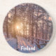 Sunset in snowy pine forest with sun ray coaster