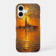 This luminous painting depicts a Venetian island bathed in glowing sunset light, where golden yellow and radiant orange dominate the sky and reflect across rippling water. A tall bell tower in brick red and pale stone stands beside domed architecture in warm beige and soft cream, silhouetted against a brilliant amber sun. The water shimmers with strokes of copper, teal, and deep indigo, layered in thick, expressive brushwork. Birds in dark charcoal glide across the glowing atmosphere. The art style resembles impressionistic oil painting, characterized by visible texture, dynamic brushstrokes, and saturated color blending that captures light, movement, and romantic atmosphere.