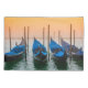 Peaceful setting next to the Doge's Palace in Venice, Italy, with four gondolas, all together pointing to a beautiful misty sunset.
