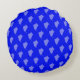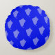 This round pillow exhibits a uniform repetition of three-pointed light blue leaves on an ultramarine blue surface.