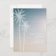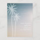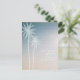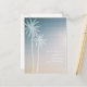 A beach wedding save the date postcard featuring an illustration of two white palm trees at left over a sunset background. Personalize the white text with details of your occasion.