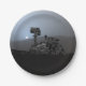 The beauty of a pale blue grey sunset on the planet Mars, as observed by the Curiosity rover which has been exploring the surface of Mars since 2012. Fine particles in the Martian atmosphere favour blue light waves over the redder shades observed on Earth. An image of Curiosity has been added to this scenic landscape for artistic effect.