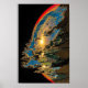 A vibrant and surreal landscape with swirling clouds and vibrant colors illuminates half of an alien planet. The sun creates a radiant halo effect.