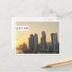 Carte postale des gratte-ciels dans l'horizon du centre commercial de Doha, la capitale du Qatar, un pays du Golfe Persique au coucher du soleil avec un cadre blanc et le texte : 'Qatar'.