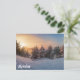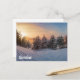 Sunset over frozen snowy forest near sea postcard
