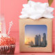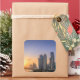 Square photo sticker with a colourful sunset over the skyline with the skyscrapers on the Corniche in the city centre of Doha, capital of the Gulf country Qatar.