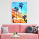Sunset beach with palm trees original art by Sacha Grossel. Red and orange sunset dreaming beach theme art in original watercolor style. Surf sunset theme.