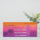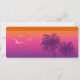 Destei's destination wedding save the date card design with a faux boarding pass looking theme. The design includes tropical purple palm tree silhouettes, three flying bird silhouettes and an airplane silhouette. The background is a beautiful orange to pink to purple gradient giving the design a tropical summer sunset look. The design has multiple personalizable text areas perfect for writing the date of the wedding, the names of the people getting married and even the location of the wedding.
