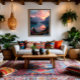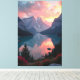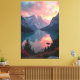 Majestic mountains rise against a pink and orange sky, whose colours mirror perfectly on the lake’s crystal-clear surface. Vibrant flowers dot the foreground, while a silent boat floats on the tranquil waters. This scene captures nature’s serenity at dusk, blending grandeur and delicacy in one moment — perfect for evoking peace and wonder at the wild world’s beauty.