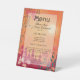 Add a touch of radiant charm to your reception tables with this pedestal-style wedding menu from the Sunset Serenade collection. Blending cultural warmth with romantic flair, the design features a glowing watercolor sky in golden amber and soft rose tones, set behind a silhouetted skyline of domes and towers, surrounded by lush floral illustrations in deep coral, cream, and teal.