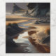 "Capture the Essence of New Zealand: Immerse yourself in the serene beauty of the South Island's rugged coastline with this captivating image. Bathed in the golden glow of a sunset, the sandy beach unfolds before your eyes, adorned with dark rocks and hues of brown sand. A gentle stream meanders through the landscape, its path leading gracefully to the vast expanse of the ocean. As warm sunlight casts long, enchanting shadows across the scene, you'll feel transported to a tranquil oasis of natural wonder. Perfect for those who yearn to bring the breathtaking landscapes of New Zealand into their home."