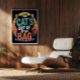 Ce graphique présente une silhouette noire frappante de la tête d'un chat, dressée contre un dégradé de coucher de soleil de style rétro vibrant dans les tons jaune, orange et bleu. Le texte en gras, "LE CHAT EST SORTI DU SAC", est affiché en évidence dans la silhouette du chat, avec les mots "CHAT" et "SAC" dans un turquoise contrasté. Une queue bouclée et ludique accentue le design, mettant l'accent sur l'idiome humoristique. Téléchargement numérique à usage personnel uniquement.
