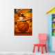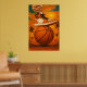An eye-catching orange and white sneaker balanced on a basketball, set against a vibrant sunset backdrop with palm trees and clouds. This image captures the essence of laid-back, tropical street style with a sporty twist.