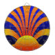 Sun Graffiti brick wall is a digital work of art with a dark blue gradient background and yellow redish orange gradient sun at the bottom, sun beams beaming up and outward.