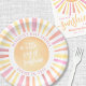 This cheerful paper plate design features a vibrant sun at the centre, with the phrase "A Little Ray of Sunshine" displayed on top. The sun’s rays shine in warm shades of yellow, orange, pink, and red, creating a bright and joyful look perfect for any sun-themed celebration.