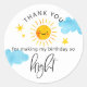 Sunshine theme kid's birthday party favour sticker featuring watercolor illustration of a smiling sun with clouds and stars. The text says "thank you for making my birthday so BRIGHT."