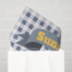 Sunshine and laughter are the message of the Sunshine Sunflower Blue-grey Gingham design. Bluegray accent banners back the sunny yellow text. Vivid watercolor sunflower painted in the centre. Customize the wording and text colours. Front background is cheery farmhouse check, reverses to matching blue-grey colour.