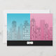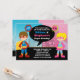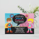 Personnalisez cette invitation du super héros de l'enfant rose et bleu et de la fête d'anniversaire de Supergirl. Comporte un paysage urbain et un garçon et une fille tous les deux habillés en tant que super héros.