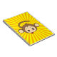 An illustration of a monkey face with blushing cheeks and his tongue sticking out. Looking cute and kawaii. The background is a cheerful yellow and orange pattern with sunrays bursting out around the monkey making him look super powerful.