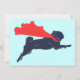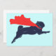 Super Pug invitations. A minimalist vector design featuring a super pug flying with a cute red cape. A great gift for fans of pugs, dogs, super hero canines and vector art.