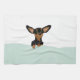 Supercute kitchen towel with illustration of a dachshund puppy under a green duvet with floppy ears and the sweetest expression.