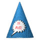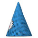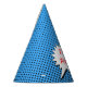 Blue and black polka dot party hat features speech bubble and area for you to highlight your child's age - text is easily editable. Easy to assemble. This dot pattern coordinates with Superhero Party Collection in our shop as well as most Superhero themed birthday parties. Also available in our shop without the speech bubble graphic.